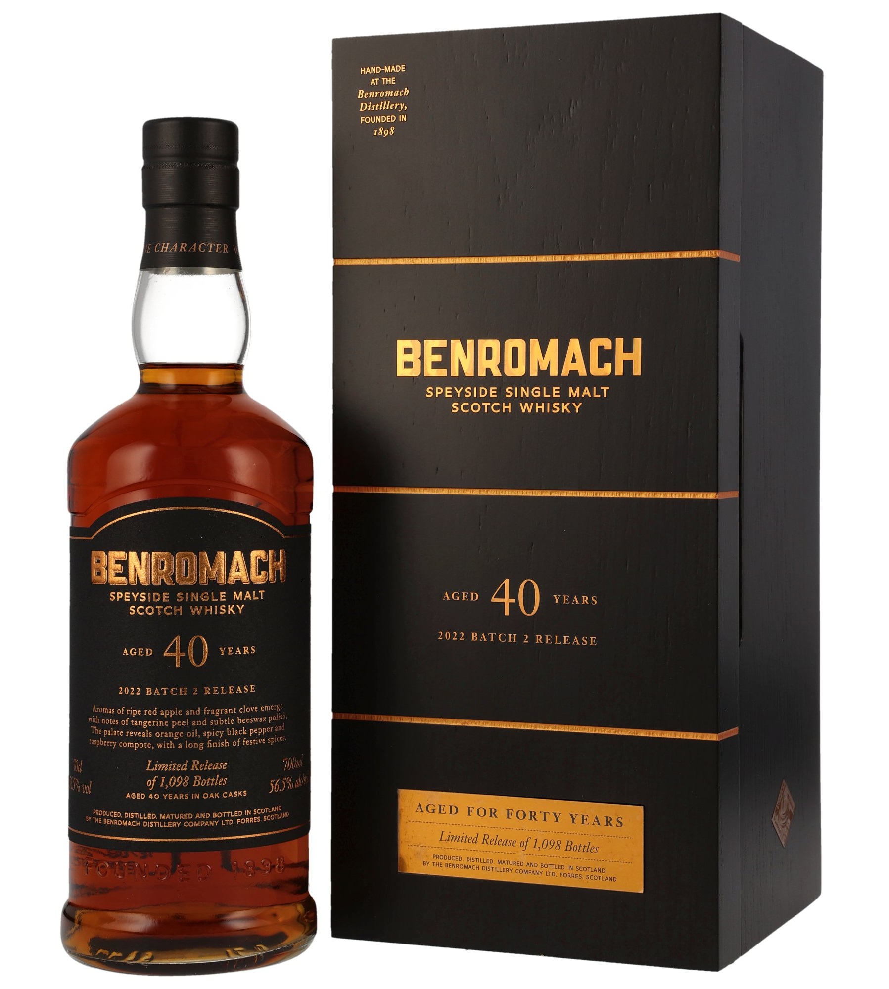 Er wird in der Regel nur einmal pro Jahr produziert: Der Benromach 40 y.o. reift ausschließlich in Sherryfässern und wird in Cask Strength abgefüllt. Wer eine der 1.098 Flaschen ergattert, wird mit Apfel und festlichen Gewürzen, Zitrusfrucht und einem Hauch von Bienenwachspolitur entlohnt.