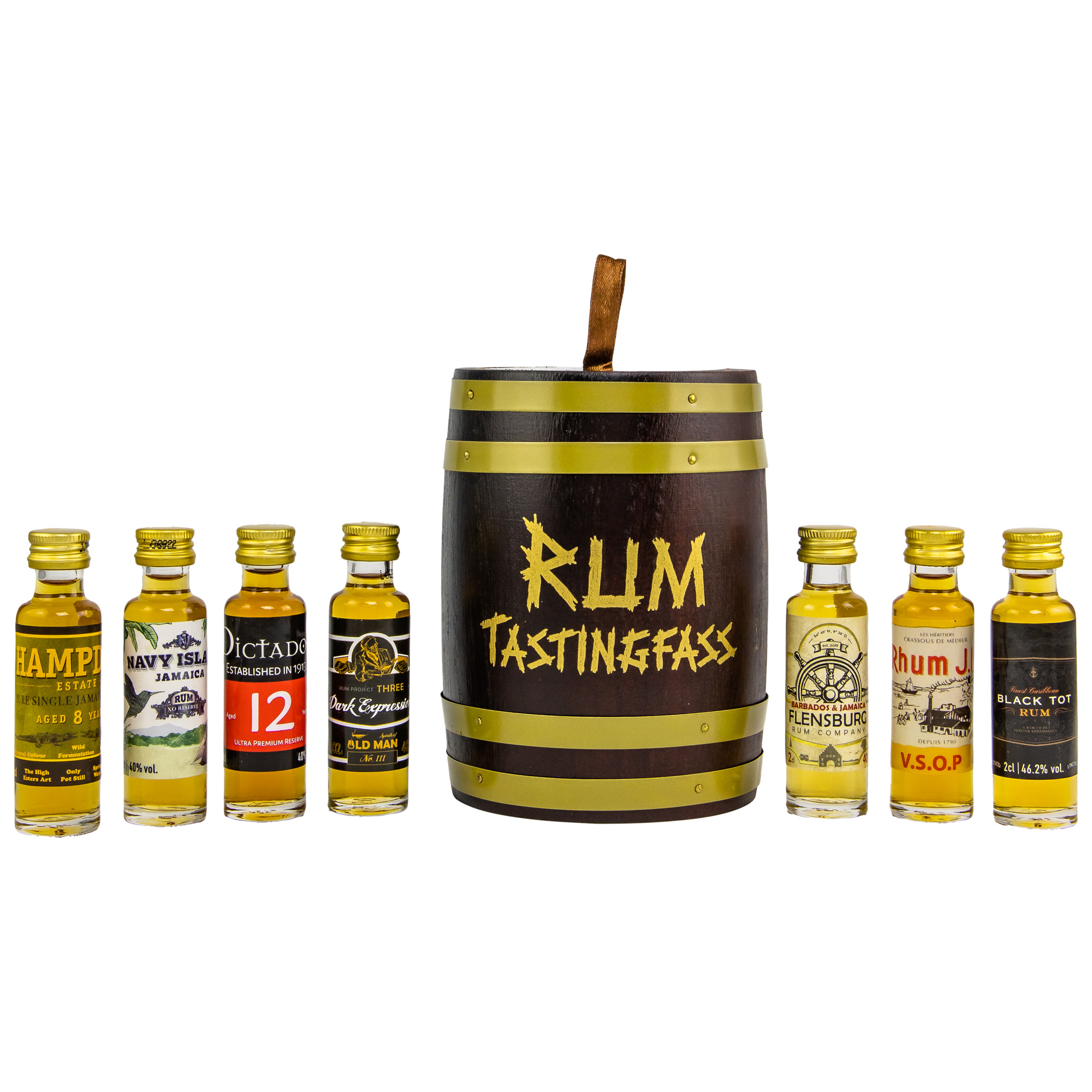 Kleines Holzfass mit 7 Rum Proben aus der Karibik, das perfekte Geschenk!