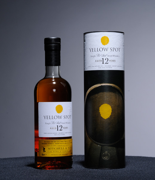 Der Yellow Spot reifte mindesten 12 Jahre in drei unterschiedlichen Faßtypen: in Bourbon Barrels, Sherry Butts und in Malaga Casks. Die Irish Distillers folgt auch mit dem Yellow Spot weiter der alten Mitchell & Son Tradition, die früher (im ersten Drittel des 20 Jh.) bereits einen Green Spot, Yellow Spot, Blue Spot & Red Spot auf den Markt gebracht hatten. Genauso wie beim Green Spot ist auch auf dem Label des Yellow Spots deren Name vermerkt: “Triple distilled, matured and bottled for Mitchell & Son“.