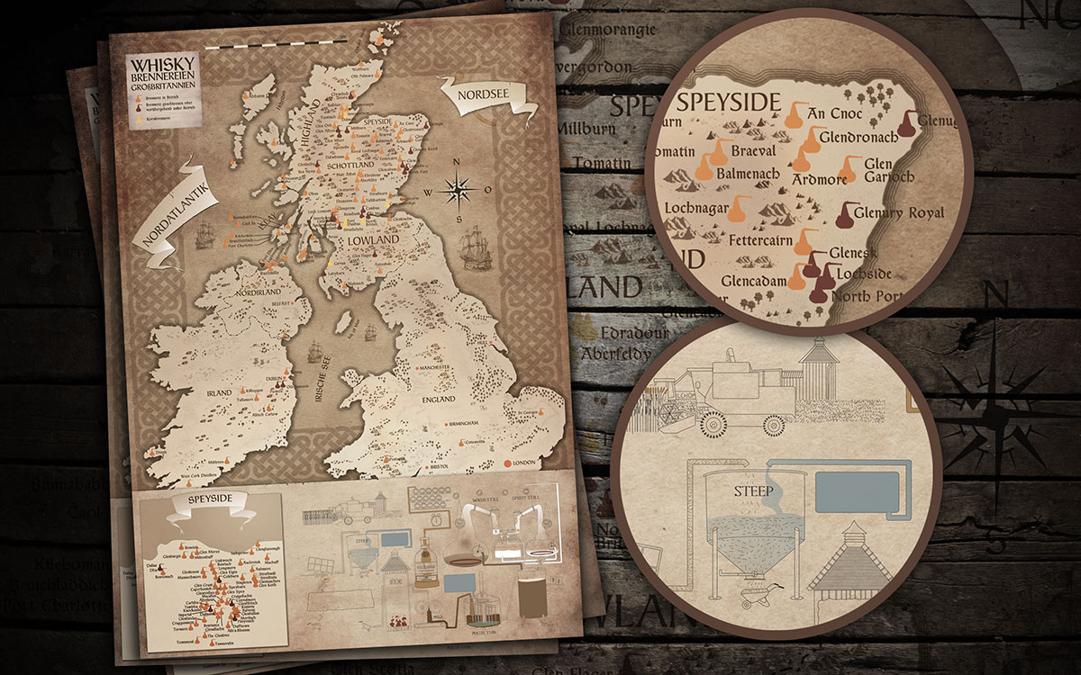 Inklusive skizzierten Herstellungsprozess und Sonderausschnitt für die Speyside